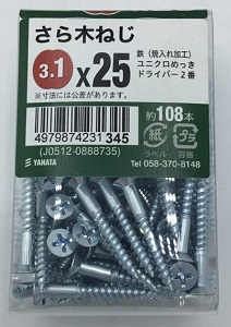 材質は鉄でユニクロ。 十字穴付きの皿頭ねじで、木材専用です。 打ち込む時に木材などにできる破損を防ぐために、ピッチが粗くなっています。 木材に使用します。 集成材など硬い木材には下穴が必要です。 八幡 さら木ねじJS 3.1X25 108本入り 商品コード: 4979874231345 491円(税込) 数量 カートに入れる お気に入りに追加