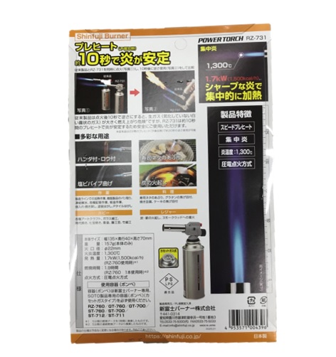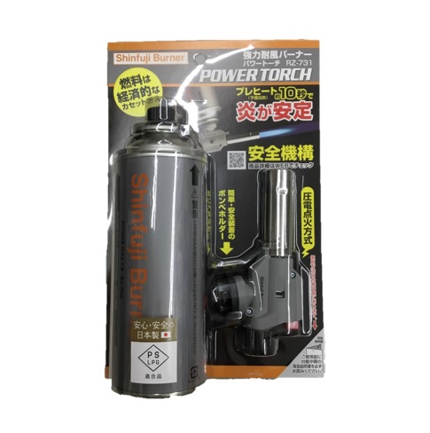 ・プレヒート(予備加熱)約10秒で炎が安定 ・シャープな炎で集中的に加熱 ・炎温度:1,300℃ ・圧電点火方式 ・PSLPG適合品 新富士バーナー パワートーチ RZ-731 商品コード: 4953571004396 3,597円(税込) 数量 カートに入れる お気に入りに追加 ・本体サイズ:幅135×奥行40×高さ70mm ・重量:157g(本体のみ) ・火口径:22mm ・火炎温度:1300℃ ・発熱量:1.7kW(1500kcal/h)(RZ-760使用時) ・燃焼時間:1.9時間(RZ-760 1本使用時) ・点火方式:圧電点火方式 使用容器(ボンベ) ・容器(ボンベ)は新富士バーナー専用、SOTO製品専用の容器(ボンベ)(カセットガスタイプ)を必ず使用ください。 RZ-760/GT-760/GT-700/ST-760/ST-700/ST-712/ST-711