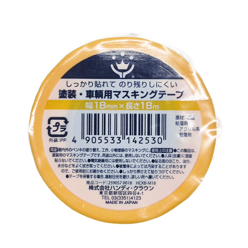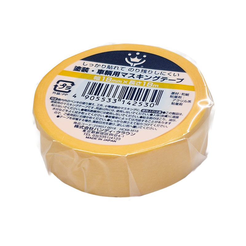 アクリル系粘着剤で、のり残りもしにくいマスキングテープです。 屋内外のペンキの塗り替え 工作・小物塗装のマスキングに! 材質/素材 ●基材:和紙●粘着剤:アクリル系粘着剤 ハンディクラウン 塗装・車両マスキングテープ 1P 18×18m 商品コード: 4905533142530 249円(税込) 数量 カートに入れる お気に入りに追加