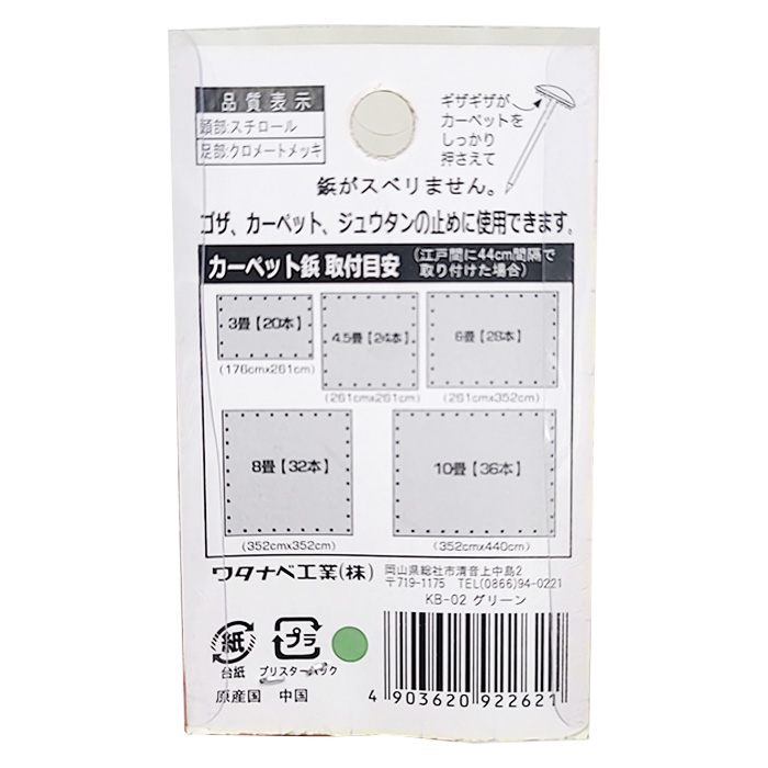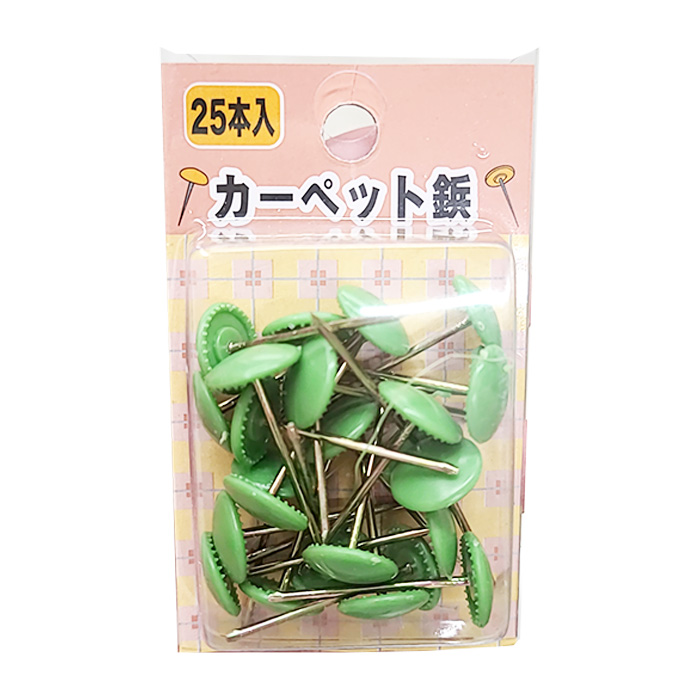 ゴザ、カーペット、ジュウタンの止めに使用できます。 ■素材 頭部:スチロール 足部:クロメートメッキ ※お使いのモニター環境により、画像の色が実物と異なって見える場合がございます。 カーペット鋲KB−02 25本入りグリーン 商品コード: 4903620922621 172円(税込) すぐ楽BOX不可 数量 すぐ楽BOX不可 カートに入れる お気に入りに追加