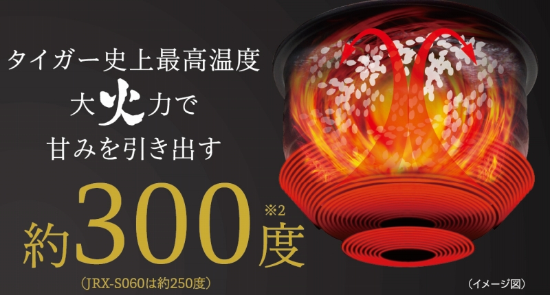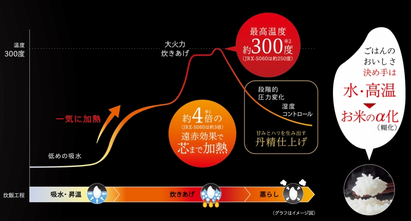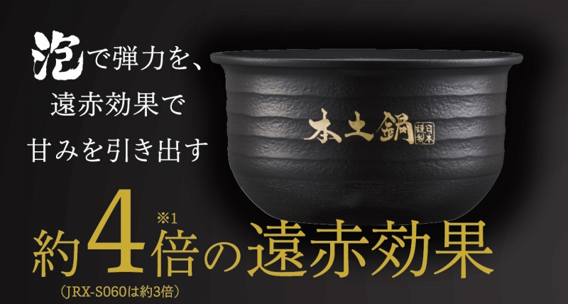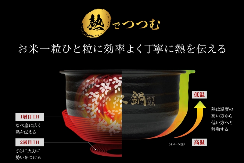 土鍋ご泡火炊き:圧倒的大火力とやさしい泡立ちで、お米一粒ひと粒の甘みと弾力を引き出します。土鍋の遠赤効果による輻射熱で、お米一粒ひと粒を芯までじっくり加熱。