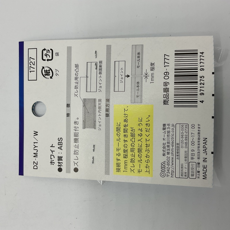 ● モールの接続部をきれいに仕上げます。 ● ホワイト1号、2個入り ■ サイズ:1号 ■ 入数:2個 ■ 材質:ABS ■ 色:ホワイト ※ 接続するモールの間に1mm程度の隙間をあけて、ズレ防止用の凸部がモールの間に入るように上からかぶせてください。 オーム電機 モール用ジョイント1号白 2個入 09-1777 商品コード: 4971275917774 304円(税込) 数量 カートに入れる お気に入りに追加