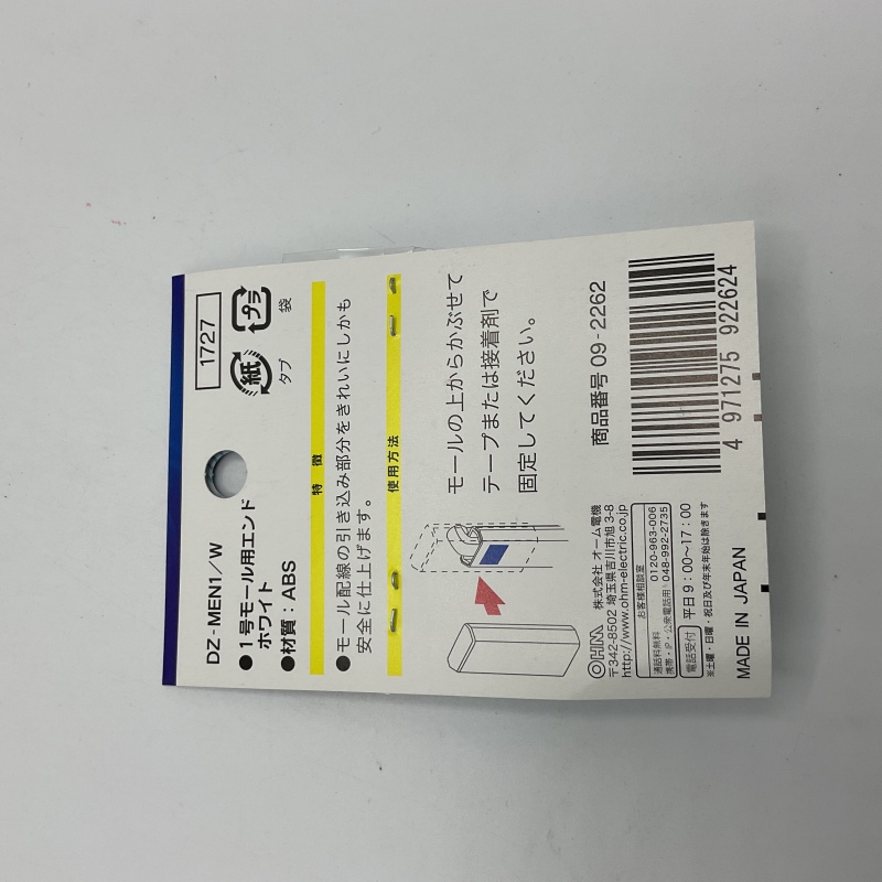 ● モール配線の引き込み部分をきれいに安全に仕上げます。 ● モールの上からかぶせてテープまたは接着剤で固定してください。 ■ 材質には環境負荷の少ないABSを使用 ■ 本体色:白 ■ 太さ:1号 ■ 入数:2個 オーム電機 1号モール用エンド 白 09-2262 商品コード: 4971275922624 326円(税込) 数量 カートに入れる お気に入りに追加