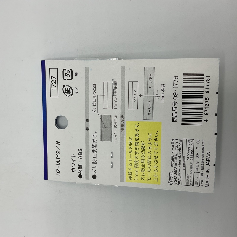 ● モールの接続部をきれいに仕上げます。 ● ホワイト2号、2個入り ■ サイズ:2号 ■ 入数:2個 ■ 材質:ABS ■ 色:ホワイト ※ 接続するモールの間に1mm程度の隙間をあけて、ズレ防止用の凸部がモールの間に入るように上からかぶせてください。 オーム電機 2号モール用ジョイント 白 09-1778 商品コード: 4971275917781 326円(税込) 数量 カートに入れる お気に入りに追加