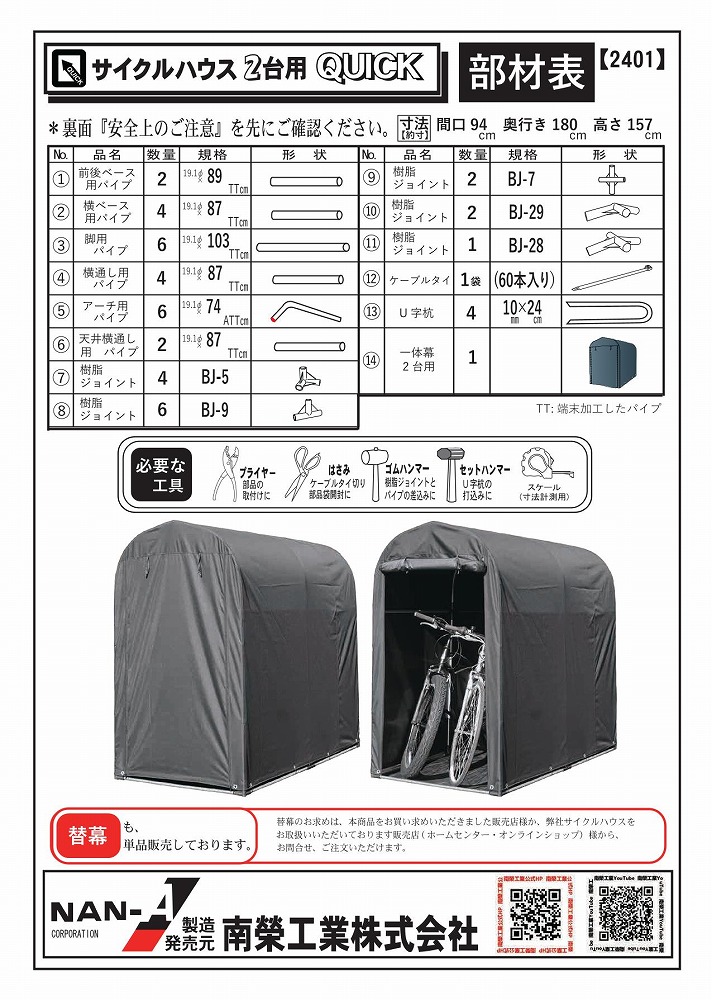 ・お客様組立品 ・撥水性のあるオックスフォードシートを使用 ・シートが一体幕で他のより組立簡単なモデルです ・前幕巻上式 ・ベースタイプ ・固定杭4本付属 ・製品寸法(約寸):間口 94cm×奥行 180cm×高さ157cm ・重量:10.5kg 南栄工業 サイクルハウスQUICK2台用 ブラック【お取り寄せ商品】 商品コード: 4984665197458 19,470円(税込) すぐ楽BOX不可 宅配便不可 数量 すぐ楽BOX不可 宅配便不可 カートに入れる お気に入りに追加 【商品のお届けについて】 ■店頭受取・SUN急便配達でのみご注文可能です。 ■SUN急便は、サンデー従業員がお届けする配達サービスです。対応エリアの確認は、下部にお届け先の郵便番号を入力で検索できます。お買上税込10,000円以上で送料無料となります。 ■店頭受取は、ネットで予約、サンデー各店でお受取りできます。商品のご準備ができましたら、ご指定の方法で連絡いたします。