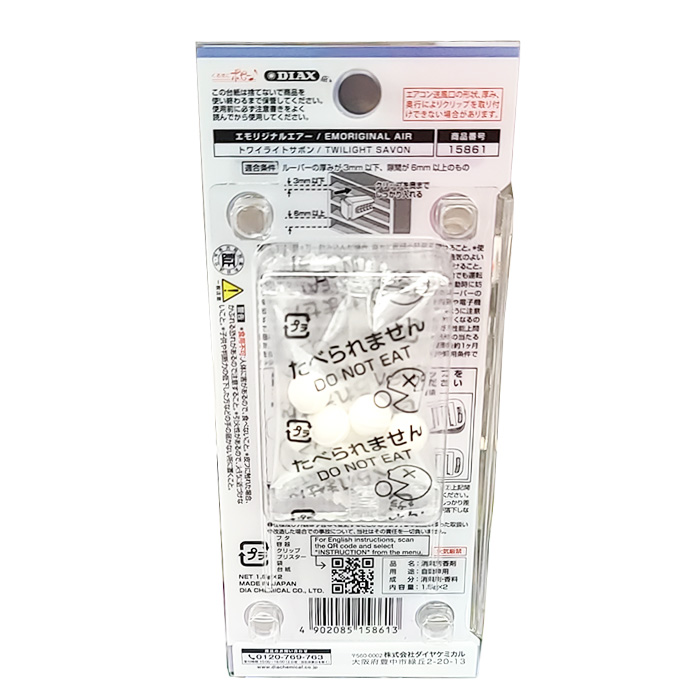 近畿大学と共同開発!Z 世代が考えるエモい 自動車用芳香剤 【トワイライトサボン】 華やかなフルーティサボンの香り ※香りの分類 フルーティフローラル ■設置場所 エアコンルーバー ■容量 1.5g×2 ダイヤケミカル エモリジナルエアー トワイライトサボン 商品コード: 4902085158613 1,067円(税込) すぐ楽BOX不可 数量 すぐ楽BOX不可 カートに入れる お気に入りに追加