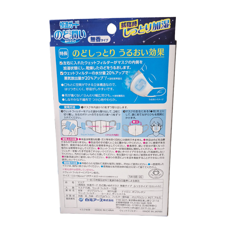 のどしっとりうるおい効果。ウェットフィルターがマスクの内側を加湿状態にし、のどをうるおします。 無香タイプ。 【素材】 ●本体:ポリプロピレン ●耳ひも部:ナイロン、ポリウレタン ●ウェットフィルター:レーヨン、ポリエステル 【包装材の材質】 外箱:紙 内袋:ポリプロピレン フィルター個包装:ポリプロピレン、PET、アルミ ※ウェットフィルターにパラベン配合。 ※蛍光染料は使用していません。 白元アース 快適ガード のど潤いぬれマスク 無香タイプ ふつうサイズ お徳用15回分 商品コード: 4902407581884 1,837円(税込) すぐ楽BOX不可 数量 すぐ楽BOX不可 カートに入れる お気に入りに追加
