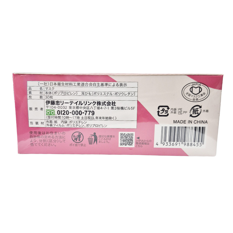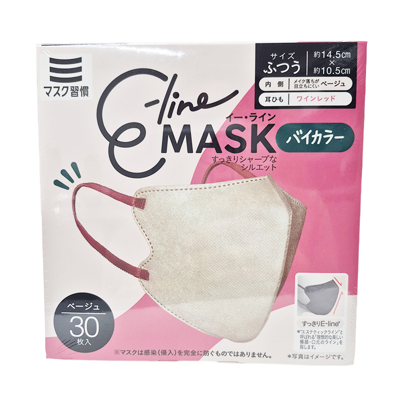 エステティックライン(E-line)と呼ばれる「理想的な美しい横顔・口元ライン」を再現したE-line MASK。 カラー 内側:メイク落ちが目立ちにくいベージュ 耳ひも:ワインレッド *内側(口元側)不織布は、メイク汚れが目立ちにくいカラータイプ(マスク本体色がホワイトの場合は、口元もホワイト) 本体サイズ: ふつうサイズ 約145×105mm 素材:本体:ポリプロピレン 耳紐:ポリエステル・ポリウレタン 伊藤忠リーテイル イーラインマスク ベージュ×ワインレッド 30枚入 商品コード: 4933691988455 656円(税込) すぐ楽BOX不可 数量 すぐ楽BOX不可 カートに入れる お気に入りに追加