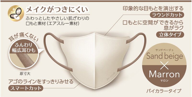・小顔に魅せるフィット感の女性用立体マスク ・すっきりみせるスマートカット ・メイクがつきにくくやさしい肌ざわり ・0.1μmの微小粒子カットの不織布フィルター 【マスクの色】サンドベージュ、耳ひも:マロン 【マスクサイズ】たて13.8×よこ10.5cm※折りたたみ時のサイズ 【素材】 ・本体・フィルタ部:ポリプロピレン、ポリエチレン、ポリエステル ・耳ひも部:ナイロン、ポリウレタン 白元アース ビースタイルマスク 立体タイプ ふつう サンドベージュ×マロン 20枚 商品コード: 4902407581921 1,067円(税込) すぐ楽BOX不可 数量 すぐ楽BOX不可 カートに入れる お気に入りに追加