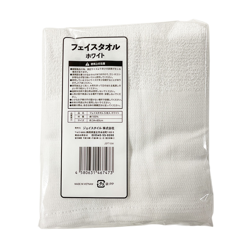 縫製品のため、表記サイズより多少の誤差が生じる場合があります。 清掃面を傷つけるおそれがありますので、ゴミ・ホコリ・砂等を必ず取り除いてから使用してください。 使用しているうちにサイズが多少収縮することがあります。ご了承ください。 使用後はよく洗い、水気をきって日の当たる風通しのよい所で乾かしてください。 塩素系洗剤や漂白剤は使用しないでください。 火気の側や高温になる場所で使用・保管しないでください。 小さなお子様の手の届かない場所で保管してください。 本来の用途以外に使用しないでください。 廃棄の際は、各自治体の廃棄区分に従ってください。 材質:綿100% フェイスタオル ホワイト 綿100% 約34×80㎝ 5枚入 商品コード: 4580631467473 546円(税込) すぐ楽BOX不可 数量 すぐ楽BOX不可 カートに入れる お気に入りに追加