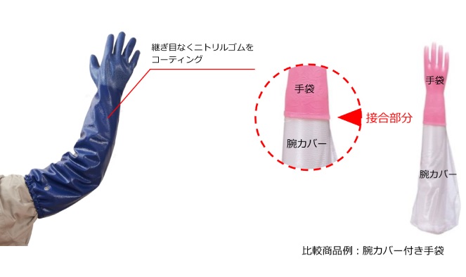 ● 一体型なので、手袋と腕カバーの接合部分から破れてしまう心配がなく、上腕部分まで丈夫です。