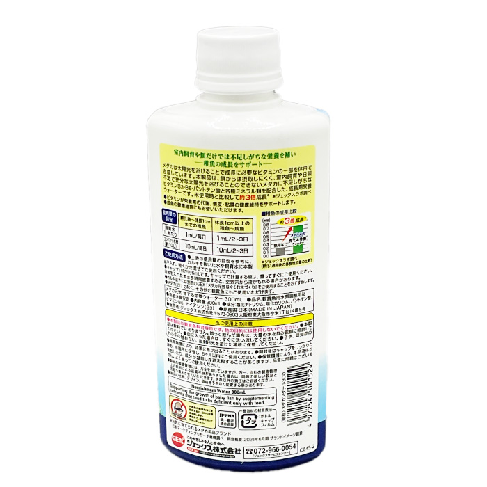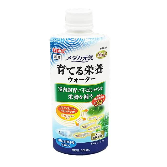 ●商品特徴 室内飼育や餌だけでは不足しがちな栄養を補い、稚魚の成長をサポート! メダカは太陽光を浴びることで成長に必要なビタミンの一部を体内で合成しています。 本製品は、餌から摂取しにくく、室内飼育や日照不足で充分な太陽光を浴びることのできないメダカに不足しがちなビタミンB3・B6・パントテン酸と各種ミネラル類を配合した、成長用栄養ウォーターです。 使用環境 淡水 内容量 300mL 個装サイズ/重量 幅6.5×奥行4.8×高さ17cm/350g GEX メダカ元気 育てる栄養ウォーター 300ml 商品コード: 4972547041524 876円(税込) すぐ楽BOX不可 数量 すぐ楽BOX不可 カートに入れる お気に入りに追加