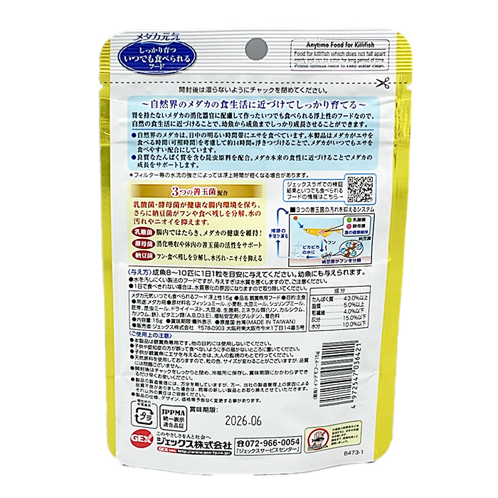 胃を持たないメダカの消化器官に配慮して作ったいつでも食べられるフードです。