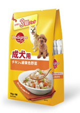 肉類(チキン、ビーフ)、野菜類(にんじん、いんげん、じゃがいも)、小麦タンパク、食物繊維、ビタミン類(B1、B2、B6、B12、E、コリン、パントテン酸、葉酸)、ミネラル類(Cl、l、K、Mg、Mn、Na、Zn)、増粘安定剤(加工でん粉)、増粘多糖類、着色料(二酸化チタン)、ポリリン酸Na、EDTA-Ca・Na