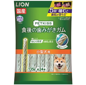 ■5回噛む※1と歯垢が落ちる※2! ■獣医師と共同開発した歯みがきガム。 ■独自のブラッシング繊維のガムをギザギザねじり形状に。 ■ギザギザねじり形状のガムを噛むことで、歯面の歯垢をかき出します。 ■噛むことで、歯垢を落として口臭を抑制します。 ■ピロリン酸ナトリウム、ポリリジン配合。 ■小型犬に適したサイズ。 ※1. 1本の歯に対して5回噛んだ場合。 ※2. 個体によって汚れ落ちの効果は異なります。また、歯石はとれません。 ※生後7ヶ月以上の愛犬に与えてください。 ライオンペット ペットキッス 食後の歯みがきガム 小型犬用 135g 商品コード: 4903351005792 601円(税込) 数量 カートに入れる お気に入りに追加 【原材料】牛皮、でん粉類、チキンエキス、米粉、食物繊維、大豆たん白、チキンオイル、チキンレバーパウダー、増粘安定剤(加工デンプン、増粘多糖類)、グリセリン、pH調整剤、酸化防止剤(ミックストコフェロール)、微粒二酸化ケイ素、亜硫酸水素ナトリウム、ピロリン酸Na、炭酸Ca、カゼインNa、ローズマリー抽出物、ポリリジン、着色料(銅葉緑素) 【栄養成分】たんぱく質20.0%以上、脂質2.0%以上、粗繊維1.0%以下、灰分3.0%以下、水分18.0%以下 【エネルギー】1本あたり約18.9kcal