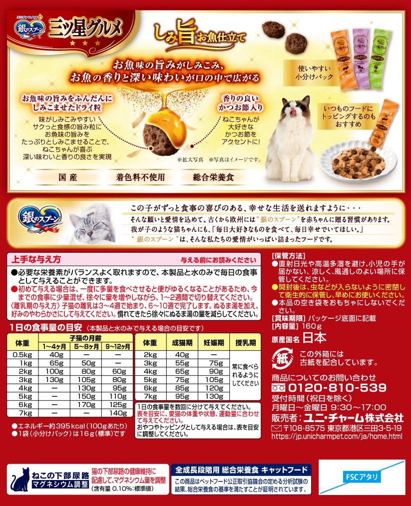 ■たっぷりしみこませた、お魚味の旨み ■旨みを練りこんだサクッと食感の粒にお魚味の旨みをふんだんにしみこませ、深い味わいを実現しました。 ※リニューアルに伴い、パッケージ・内容等予告なく変更する場合がございます。あらかじめご了承ください。 ユニ・チャーム 銀のスプーン三ツ星グルメ しみ旨お魚仕立てお魚・鶏ささみレシピ3種のアソート 160g 商品コード: 4520699623039 326円(税込) すぐ楽BOX不可 数量 すぐ楽BOX不可 カートに入れる お気に入りに追加 【原材料】穀類(小麦粉、コーングルテンミール)、肉類(チキンエキス、ビーフミール、チキンミール、ポークミール、ササミパウダー)、動物性油脂、魚介類(フィッシュエキス、かつお節、まぐろミール、かつおミール、ホタテパウダー)、ビール酵母、酵母エキス、ミネラル類(カルシウム、塩素、コバルト、銅、鉄、ヨウ素、カリウム、マンガン、ナトリウム、リン、亜鉛)、調味料、ビタミン類(A、B1、B2、B6、B12、C、D、E、K、コリン、ナイアシン、パントテン酸、ビオチン、葉酸)、アミノ酸類(タウリン)、酸化防止剤(ミックストコフェロール、ハーブエキス) 【栄養成分】たんぱく質30.0%以上、脂質16.0%以上、粗繊維3.0%以下、灰分7.0%以下、水分10.0%以下 【エネルギー】約395kcal/100g