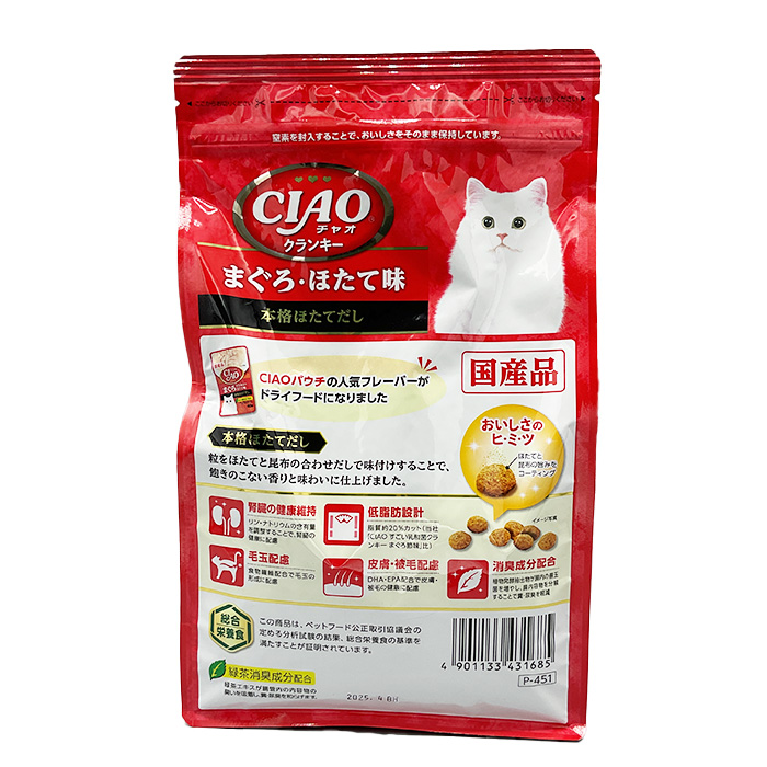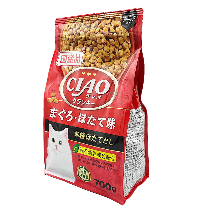 穀類(とうもろこし、コーングルテンミール、小麦粉、小麦ふすま等)、肉類(ミートミール、チキンミール、ポークミール、チキンレバーパウダー)、豆類(乾燥おから、脱脂大豆等)、魚介類(フィッシュエキス(DHA・EPA含有)、フィッシュミール(DHA・EPA含有)、フィッシュパウダー、まぐろ節パウダー、ほたてエキスパウダー)、ビートパルプ(食物繊維源)、油脂類(動物性油脂、植物性油脂)、昆布エキスパウダー、ビール酵母、酵母細胞壁、植物発酵抽出物、ミネラル類(カルシウム、リン、カリウム、鉄、亜鉛、銅、ヨウ素)、ビタミン類(A、D、E、K、B₁、B₂、葉酸、コリン)、アミノ酸類(メチオニン、タウリン)、pH調整剤、緑茶エキス