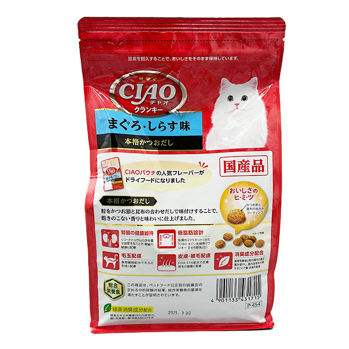穀類(とうもろこし、コーングルテンミール、小麦粉、小麦ふすま等)、肉類(ミートミール、チキンミール、ポークミール、チキンレバーパウダー)、豆類(乾燥おから、脱脂大豆等)、魚介類(フィッシュエキス(DHA・EPA含有)、フィッシュミール(DHA・EPA含有)、フィッシュパウダー、まぐろ節パウダー、しらすパウダー、かつお節エキスパウダー)、ビートパルプ(食物繊維源)、油脂類(動物性油脂、植物性油脂)、昆布エキスパウダー、ビール酵母、酵母細胞壁、植物発酵抽出物、ミネラル類(カルシウム、リン、カリウム、鉄、亜鉛、銅、ヨウ素)、ビタミン類(A、D、E、K、B1、B2、葉酸、コリン)、アミノ酸類(メチオニン、タウリン)、pH調整剤、緑茶エキス