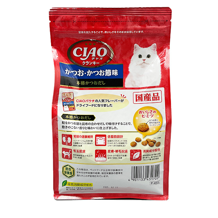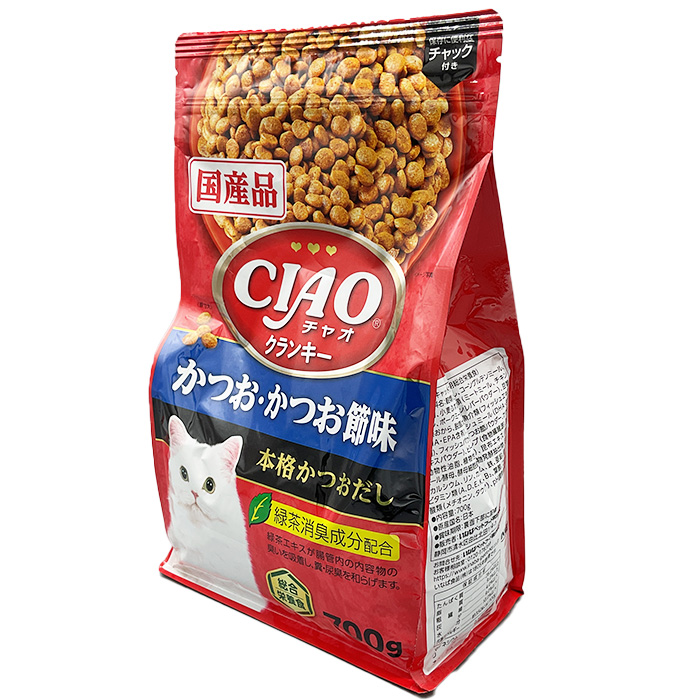 穀類(とうもろこし、コーングルテンミール、小麦粉、小麦ふすま等)、肉類(ミートミール、チキンミール、ポークミール、チキンレバーパウダー)、豆類(乾燥おから、脱脂大豆等)、魚介類(フィッシュエキス(DHA・EPA含有)、フィッシュミール(DHA・EPA含有)、フィッシュパウダー、かつお節パウダー、かつお節エキスパウダー)、ビートパルプ(食物繊維源)、油脂類(動物性油脂、植物性油脂)、昆布エキスパウダー、ビール酵母、酵母細胞壁、植物発酵抽出物、ミネラル類(カルシウム、リン、カリウム、鉄、亜鉛、銅、ヨウ素)、ビタミン類(A、D、E、K、B1、B2、葉酸、コリン)、アミノ酸類(メチオニン、タウリン)、pH調整剤、緑茶エキス