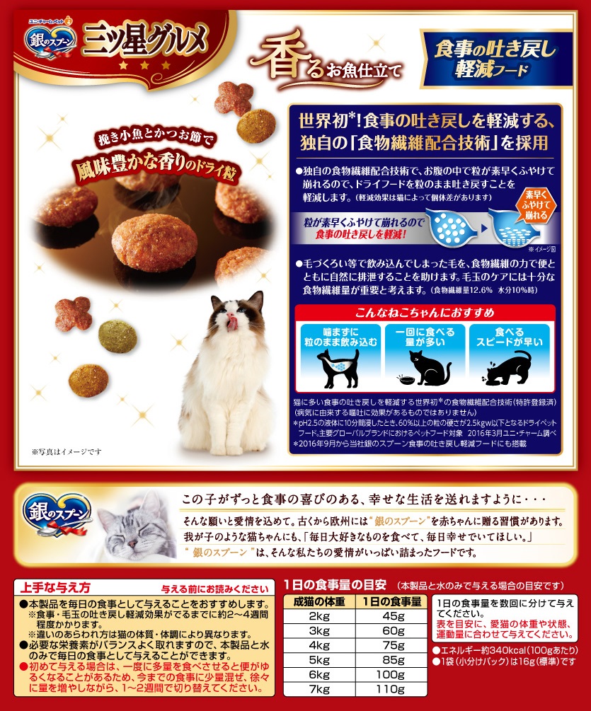 香りまで贅沢な、お魚の美味しさが詰まったキャットフード(ドライタイプ)です。 ※リニューアルに伴い、パッケージ・内容等予告なく変更する場合がございます。あらかじめご了承ください。 ユニ・チャーム 銀のスプーン 三ツ星グルメ 香るお魚仕立て食事の吐き戻し軽減フード 192g 商品コード: 4520699624524 326円(税込) すぐ楽BOX不可 数量 すぐ楽BOX不可 カートに入れる お気に入りに追加 【原材料】穀類(トウモロコシ、小麦粉)、肉類(チキンミール、ビーフミール、ポークミール、チキンエキス)、セルロースパウダー、動物性油脂、魚介類(フィッシュエキス、まぐろミール、かつお節、煮干パウダー、白身魚ミール、乾燥シラス)、ビール酵母、野菜類(ビートパルプ)、ミネラル類(カルシウム、塩素、コバルト、銅、鉄、ヨウ素、カリウム、マンガン、リン、亜鉛)、調味料、ビタミン類(A、B1、B2、B6、B12、C、D、E、K、コリン、ナイアシン、パントテン酸、ビオチン、葉酸)、着色料(二酸化チタン、赤色102号、赤色106号、黄色4号、黄色5号、青色1号)、アミノ酸類(タウリン)、酸化防止剤(ミックストコフェロール、ハーブエキス) 【栄養成分】たんぱく質30.0%以上、脂質9.0%以上、粗繊維9.0%以下、灰分8.0%以下、水分10.0%以下 【エネルギー】約340kcal/100g