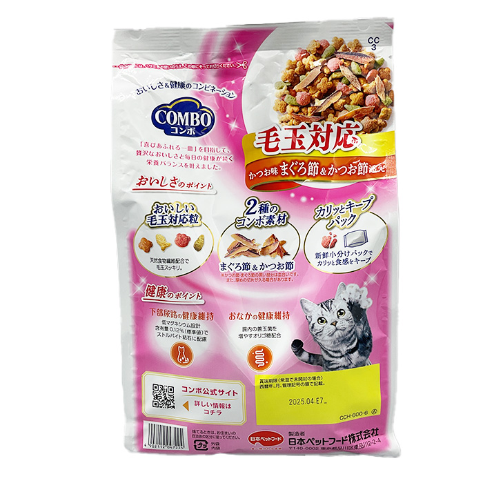 穀類(トウモロコシ、コーングルテンミール、小麦粉、パン粉)、肉類(チキンミール、牛肉粉、豚肉粉)、魚介類(フィッシュミール、フィッシュパウダー、マグロブシ、カツオブシ、マグロエキス、小魚粉末、カツオ節粉、カツオエキス、シラスパウダー)、油脂類(動物性油脂、植物性油脂)、脱脂大豆、オリゴ糖、ハーブ(タイム、ディル、フェンネル)、野菜類(トマト、ニンジン、ホウレンソウ)、クランベリーパウダー、ミネラル類(カルシウム、リン、カリウム、ナトリウム、クロライド、銅、亜鉛、ヨウ素)、pH調整剤、アミノ酸類(タウリン、トリプトファン、メチオニン)、ビタミン類(A、B1、B2、B6、B12、D、E、K、ニコチン酸、パントテン酸、葉酸、コリン)、酵母細胞壁(食物繊維源)、着色料(二酸化チタン、食用赤色102号、食用赤色106号、食用黄色5号、食用青色1号)、酸化防止剤(ミックストコフェロール、ローズマリー抽出物)、グルコサミン、コンドロイチン