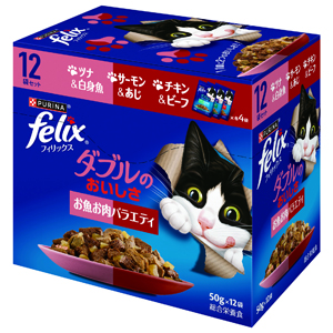 ・やわらかくほぐした2種類のお肉やお魚のおいしさをジューシーなゼリーで包み込んだ自慢のごはん。 ・2つの味を1皿で味わえてネコさん大満足! ・選べる楽しさが3種類入ったバラエティパック。 ネスレ日本 フィリックスパウチ ダブルのおいしさお魚お肉バラエティ 50g×12袋 商品コード: 4902201216098 766円(税込) すぐ楽BOX不可 数量 すぐ楽BOX不可 カートに入れる お気に入りに追加 ★ツナ&白身魚 肉類(チキン、ラム、家禽ミール等)、小麦たんぱく、魚介類(ツナ、白身魚等)、鶏脂(オメガ6脂肪酸源)、ぶどう糖、アミノ酸類(タウリン)、増粘多糖類、ミネラル類(Ca、P、K、Na、Cl、Mg、Fe、Cu、Mn、Zn、I)、カラメル色素、ビタミン類(A、D、E、K、B1、B2、パントテン酸、ナイアシン、B6、葉酸、ビオチン、B12、コリン) ★サーモン&あじ 肉類(チキン、ラム、家禽ミール等)、小麦たんぱく、魚介類(サーモン、あじ等)、ぶどう糖、鶏脂(オメガ6脂肪酸源)、アミノ酸類(タウリン)、増粘多糖類、ミネラル類(Ca、P、K、Na、Cl、Mg、Fe、Cu、Mn、Zn、I)、カラメル色素、ビタミン類(A、D、E、K、B1、B2、パントテン酸、ナイアシン、B6、葉酸、ビオチン、B12、コリン) ★チキン&ビーフ 肉類(チキン、ビーフ、家禽ミール等)、小麦たんぱく、ぶどう糖、鶏脂(オメガ6脂肪酸源)、アミノ酸類(タウリン)、増粘多糖類、ミネラル類(Ca、P、K、Na、Cl、Mg、Fe、Cu、Mn、Zn、I)、カラメル色素、ビタミン類(A、D、E、K、B1、B2、パントテン酸、ナイアシン、B6、葉酸、ビオチン、B12、コリン) 【栄養成分】 たんぱく質:12%以上、脂質:2.8%以上、粗繊維:0.5%以下、灰分3%以下、水分82%以下