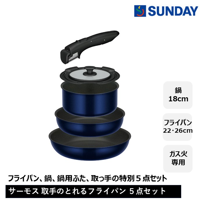 ◆サーモス 取っ手の取れるフライパン5点セット KSEー5A DPBL ガス火専用【鍋18cm/フライパン22cm/フライパン26cm/鍋専用フタ18cm/専用取っ手】
