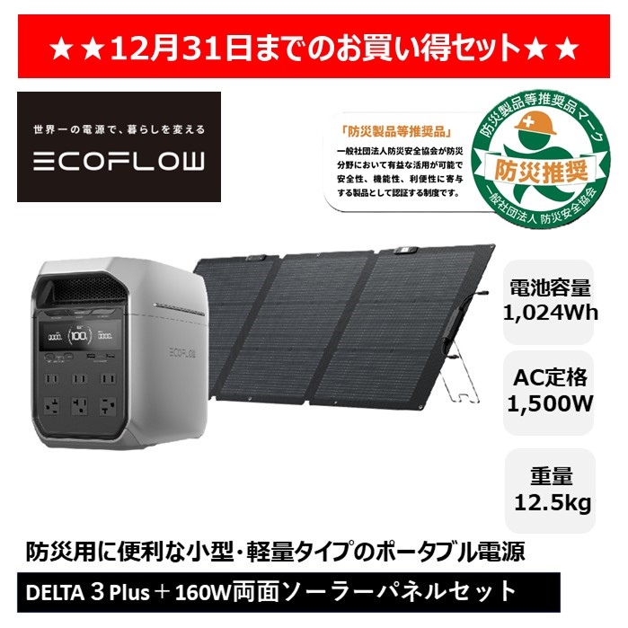 【ネットショップ限定】EcoFlow(エコフロー) ポータブル電源 DELTA3Plus(デルタ3プラス) +160W両面ソーラーパネルGen2セット【お取り寄せ商品】